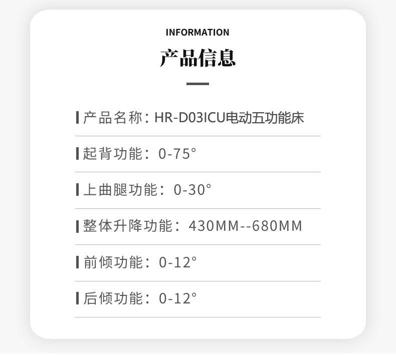 產(chǎn)品中心 > 醫(yī)用手動(dòng)病床系列 > HR-D03ICU電動(dòng)五功能床