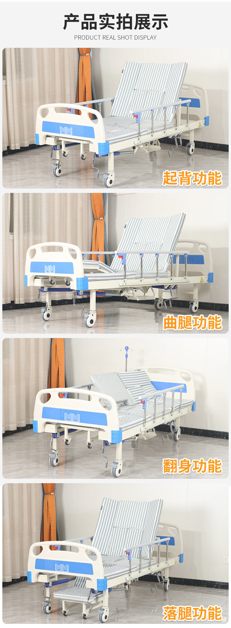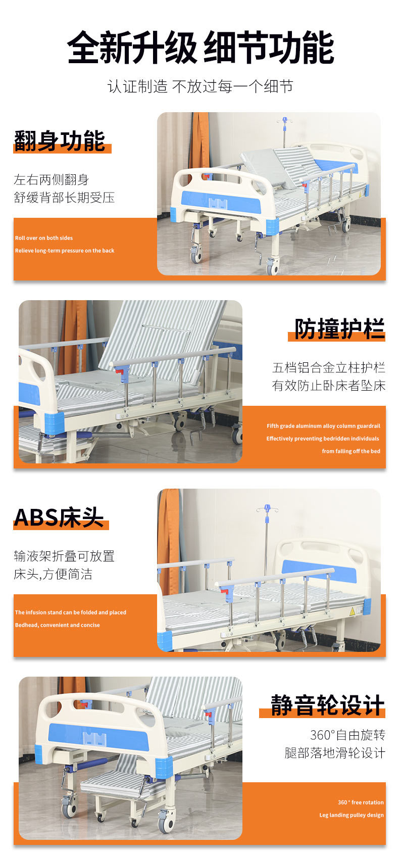 標(biāo)準(zhǔn)配置:ABS床頭1副;鋁合金折疊護(hù)欄1副;靜音輪4個(gè);